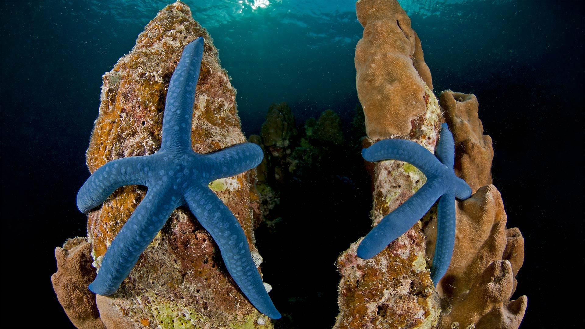 在印度洋-太平洋海域的浅水区,你会遇见蓝指海星。它们通常依附或隐藏在岩石的下面。图中的这对海星是在巴布亚新几内亚的新爱尔兰区域被发现的。尽管它们的名字中带着“蓝色”,但这种海星也有紫色、粉色和橙色的。这些美丽的颜色使得蓝指海星备受人们的欢迎。持续捕捞导致它们的种群数量受到了很大威胁。在不受干扰的情况下,蓝指海星可以在野外存活长达10年。科学家们还研究了蓝指海星与生俱来的潜在抗肿瘤和抗菌的特性。