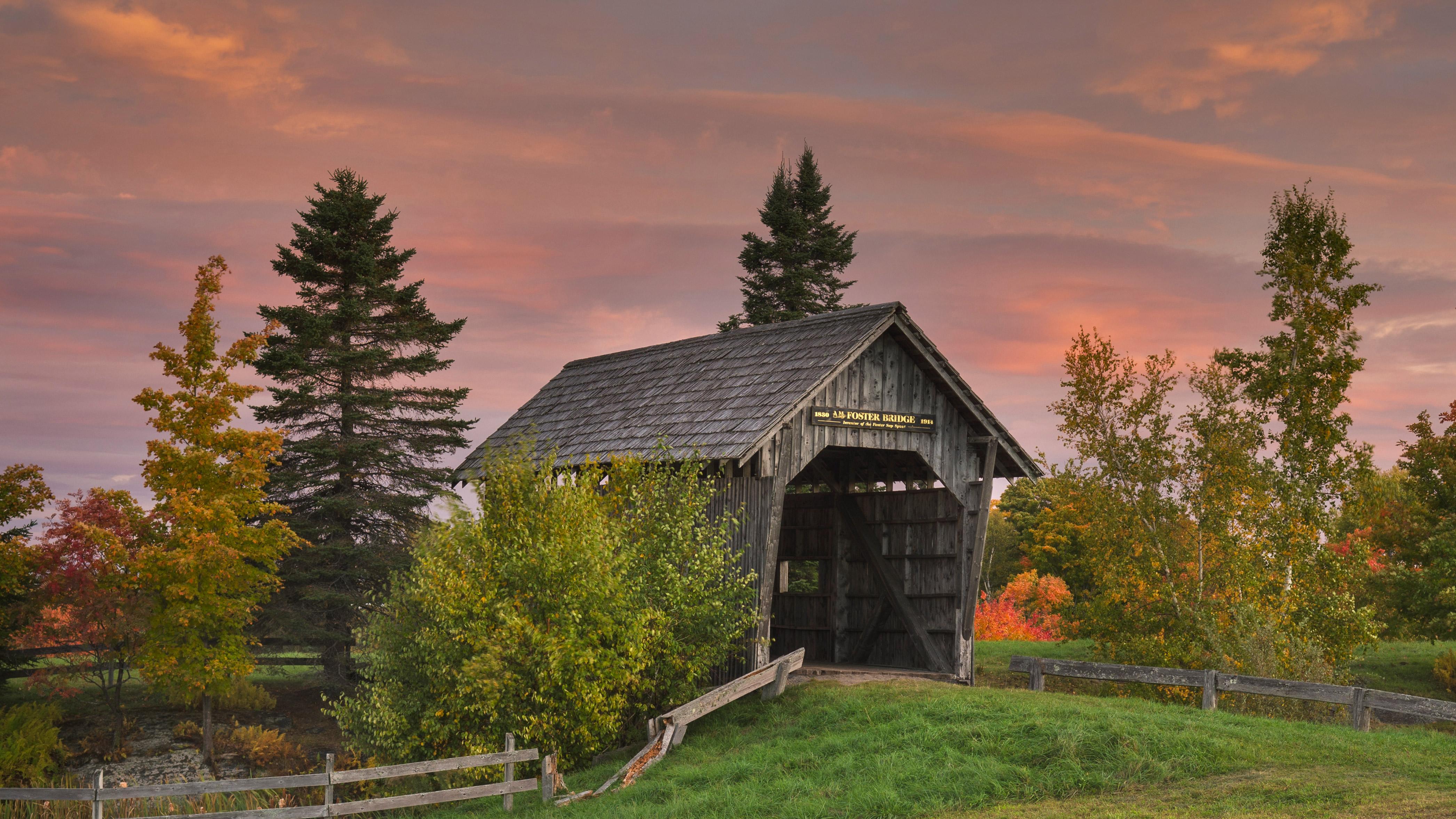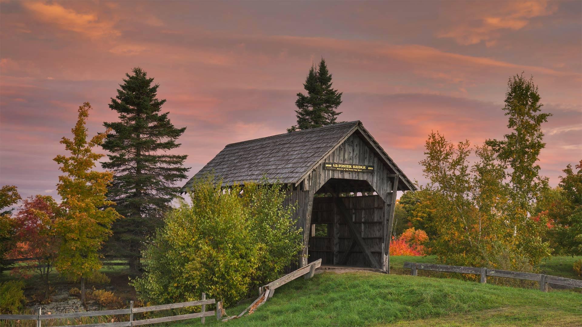 福斯特廊桥位于斯波尔丁农场。但实际上,福斯特廊桥建于20世纪90年代,是1890年建成的一座农场桥(奥顿桥)的复制品。尽管是复制品,福斯特廊桥却真正是纯手工打造的,使用了云杉木和回收的花岗岩。它只用了不到6周的时间就建成了,跨度45英尺,横跨一个人造池塘,连接起两个农场。不幸的是,由于尺寸计算错误,对于现代农业设备来说,它太窄了。不过,它仍然是个拍照和举行婚礼的好地方。