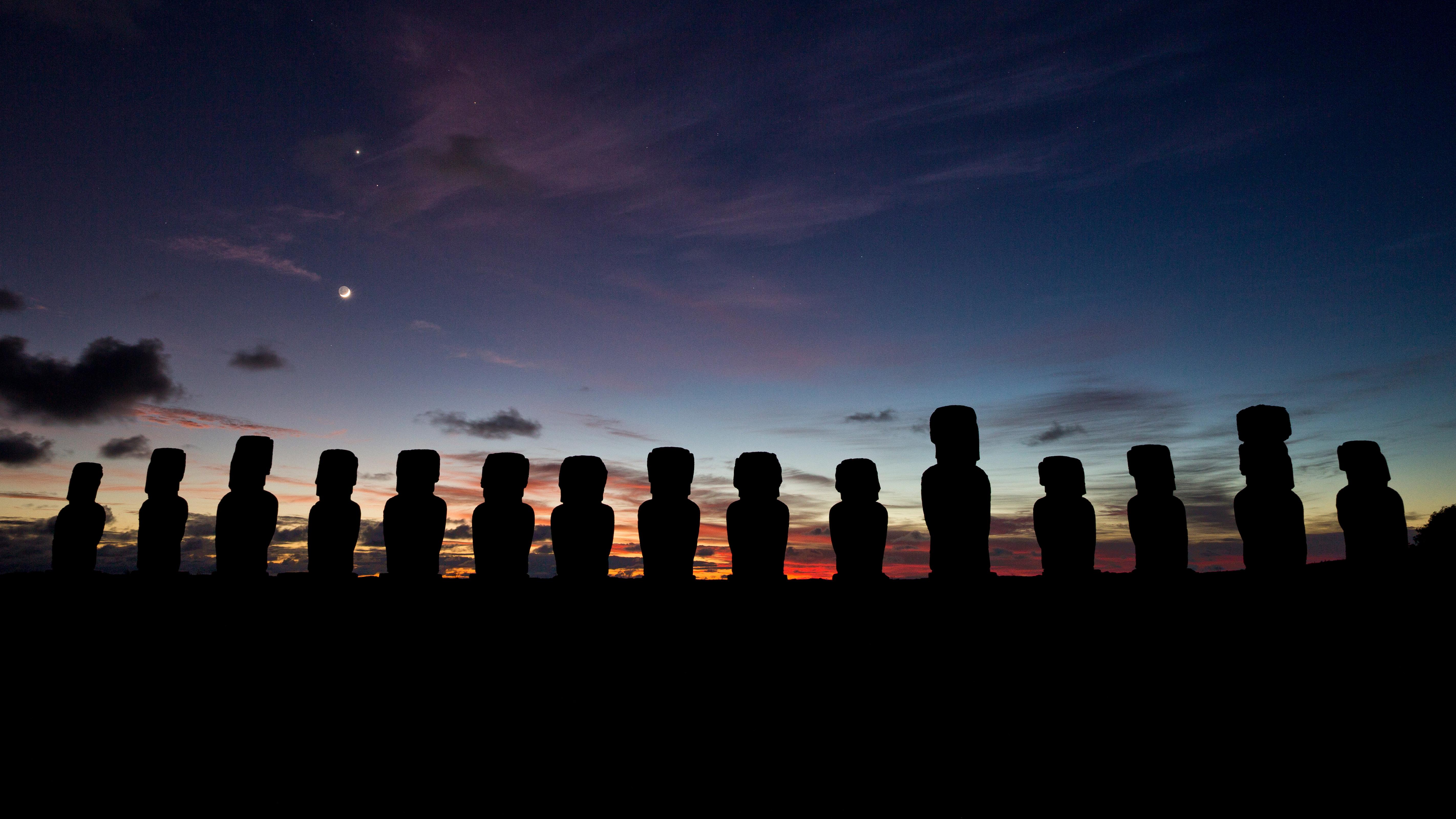 今天,照片上呈现的是久负盛名的摩艾石像,它位于智利偏远的复活节岛上。这些巨人石像是由拉帕努伊人在1250年到1500年之间用岩石雕刻而成的,全岛共有近1000座石像。考古学家认为,拉帕努伊人用这些石像纪念他们的祖先,并将其视为权力和权威的象征。这些石像里有7座面朝大海,其余石像都是背对着太平洋,面朝内陆看着村庄,仿佛是在保护着拉帕努伊人。