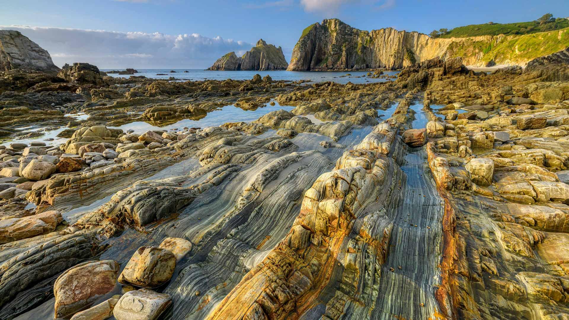 海岸线上的地质奇观是由石英岩历经数百万年才形成的:当石英颗粒逐渐取代原始岩石并保持其纹理时,这一壮丽的景观也就随之出现了。这些岩石有着复杂的花纹和颜色,其中一些看起来就像古旧的木头。