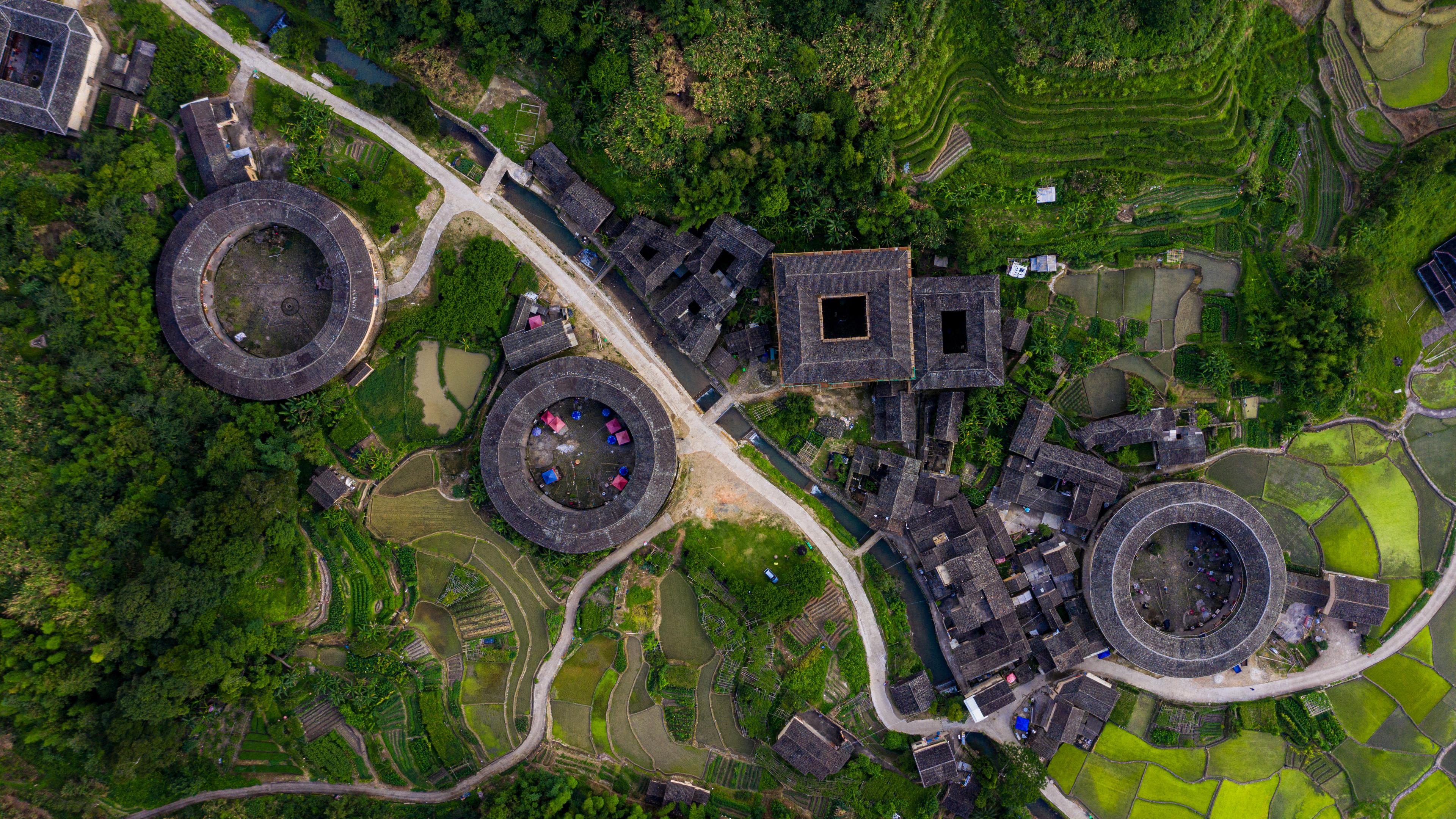 准备好踏入独特的建筑世界了吗?在这里,主流的住宅是如此的古旧。今天的图片展示的是福建土楼,它们修建于12世纪至20世纪,是中国福建东南部山区客家人独一无二的乡村住宅。客家人是汉族的一个独特分支,拥有独特的客家文化。福建土楼便是客家人在辗转迁徙中,发扬古老建筑技术创造的“建筑奇迹”。土楼以竹条作为支撑,由粘土、沙土和灰瓦建造而成。这些圆形住宅有着浅色的墙壁,深色的屋顶和宽敞的内部空间,从上往下看,它们就像一个个巨大的轮胎或卷筒侧躺在道路旁。