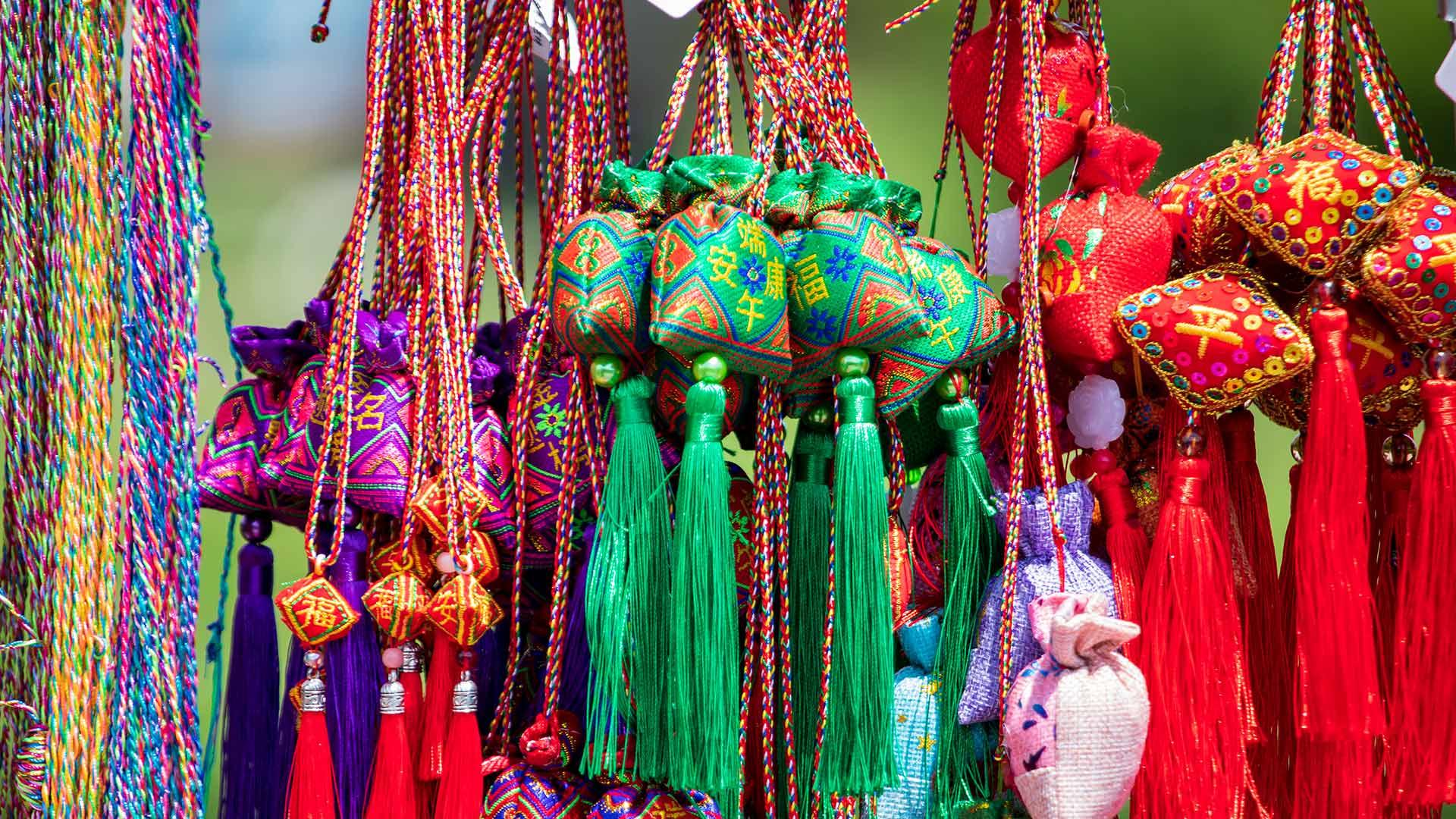 在中国传统文化中,象征五方五行的五种颜色“青、红、白、黑、黄”被视为吉祥色。端午以五色丝线系臂,曾是很流行的节俗。传到后世,即发展成如长命缕、长命锁、香包等许多种漂亮饰物,制作也日趋精致,成为端午节特有的民间艺品。
