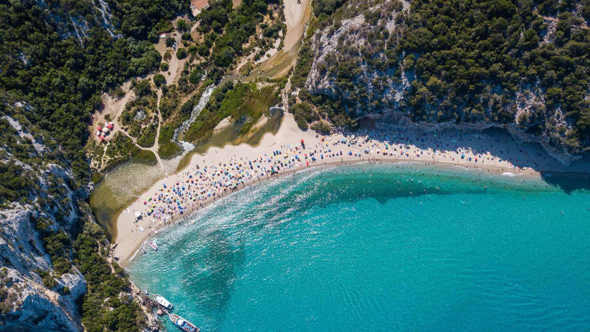 意大利撒丁岛以其崎岖的悬崖、隐秘的海滩以及层层叠叠的蓝色海水,堪称地中海的一颗明珠。全岛海岸线长度超过1100英里。尽管岛上自然河流稀少,其中提尔索河为最长河流,撒丁岛通过水利工程建设了54座人工湖与水坝。其中最重要的两座为奥莫代奥湖与科吉纳斯湖,分别为当地的重要水源及电力供应地。 今日图中所见的卡拉卢纳海滩,位于撒丁岛东海岸的奥罗塞伊湾,在伊卢内河入海口处,坐落于月亮峡谷尽头。这片金色沙滩被海拔950英尺以上的白色石灰岩悬崖所环绕,亦是理想的攀岩胜地。这里的海水近岸浅而清澈,逐渐加深,非常适合浮潜、潜水及垂钓等活动。在当地努奥罗方言中,“月亮”一词被称为“elu
