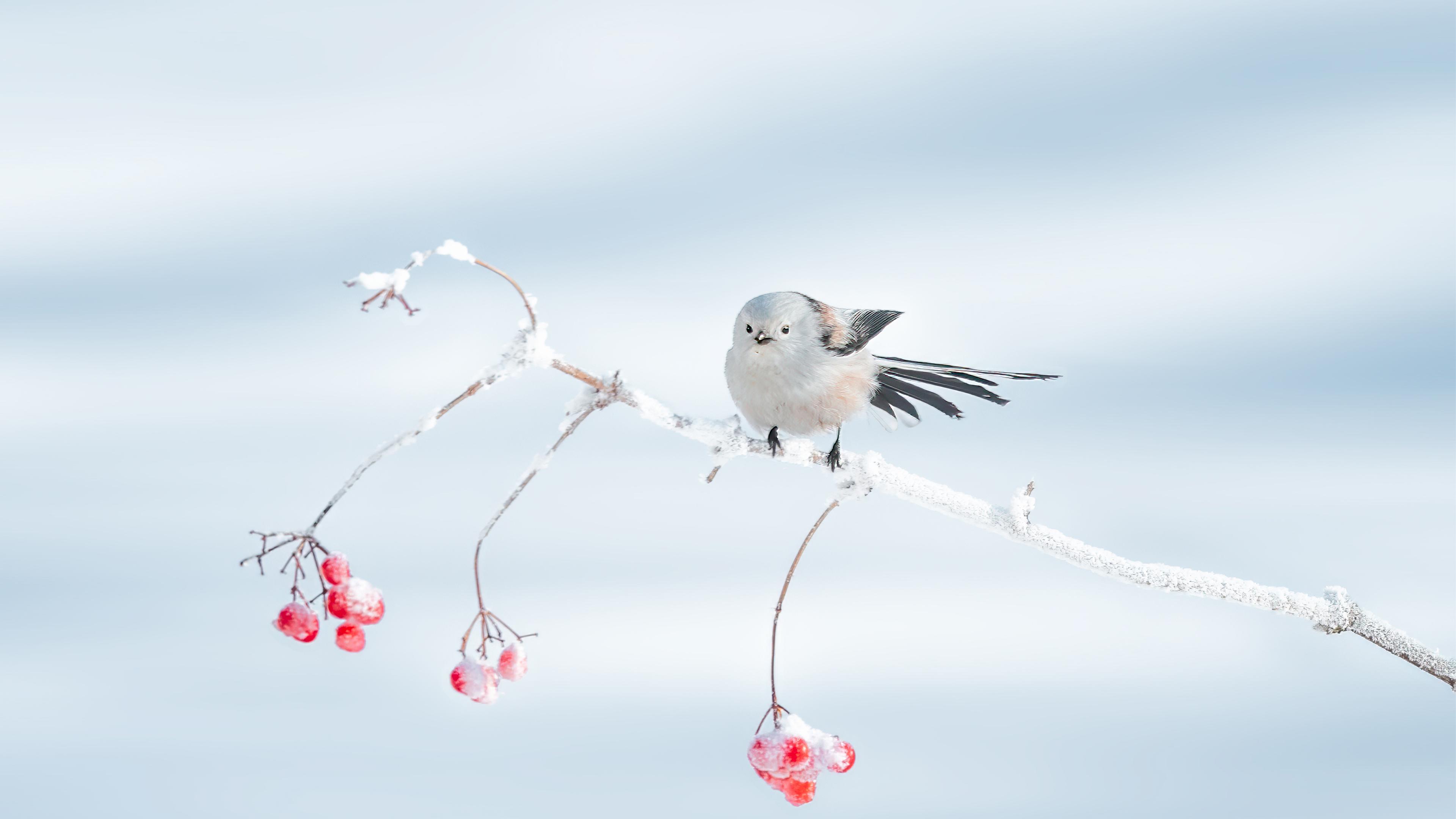 )是二十四节气中的最后一个节气。它意味着一年中最寒冷的时刻。大寒过后,立春开始,标志着新一轮节气的开始。 随着大寒的临近,过年的喜庆气氛也随之浓厚起来。大寒节气往往与年末相吻合,许多相关习俗都蕴含着辞旧迎新的寓意。 今天的图片展示的是一簇簇鲜红的浆果,覆盖着一层霜冻的釉面,看起来就像新年挂起的小灯笼,在白雪覆盖的树枝上闪闪发光。在这些红色和闪光中,矗立着一只柔软可爱的小动物。这是一只丰满的长尾山雀!它圆滚滚的像个糯米团,蓬松的灰白色羽毛被寒风吹得微微颤动,看起来就像披了一件厚厚的毛茸茸的外衣。最有趣的是它身后拖着一条又长又俏皮的黑尾巴,上下晃动着,看起来无比迷人。